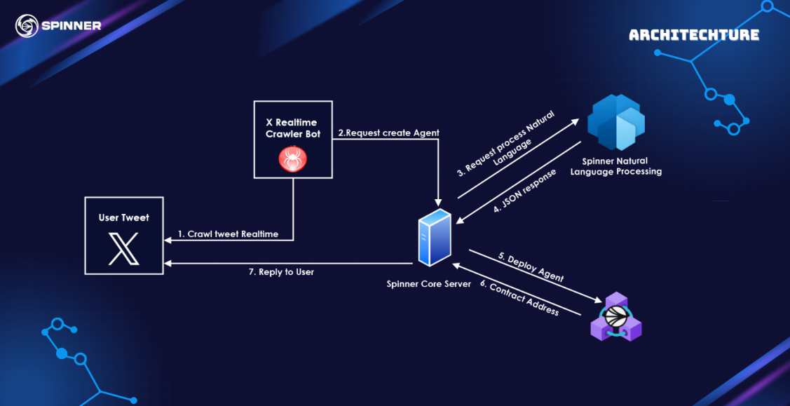 Spinner’s AI scans your tweet and retweets with CA and a link to the token’s live page on <https://spinner.so/>&#x20;